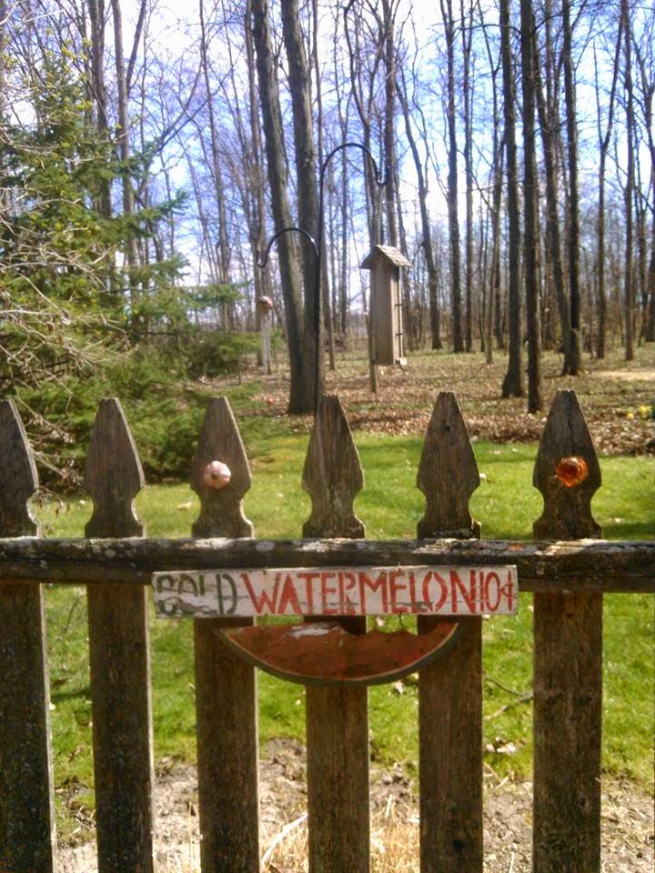 The watermelon sign was the only thing we salvaged from the recent floods. My dad had two employees: my mother and I. Mom was the flower expert and I was the produce go to guy. We were very good. Twelve years on the same country road corner vanished in just a few hours. Dad wept!