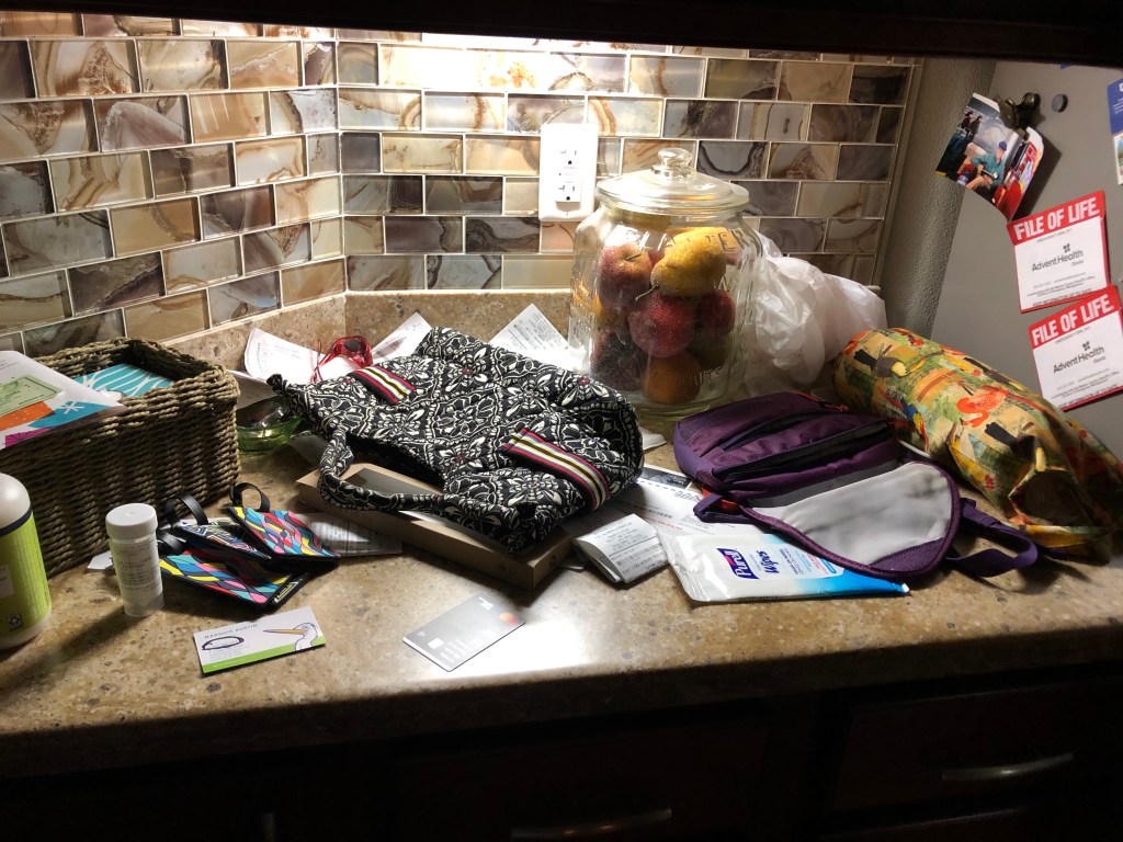 The counter space reflects her busy life even as we emerge from this devastating pandemic. The two purses are used for specific purposes which I have never understood. I cringe when she ask me to bring her purse. I invariably choose the wrong one.